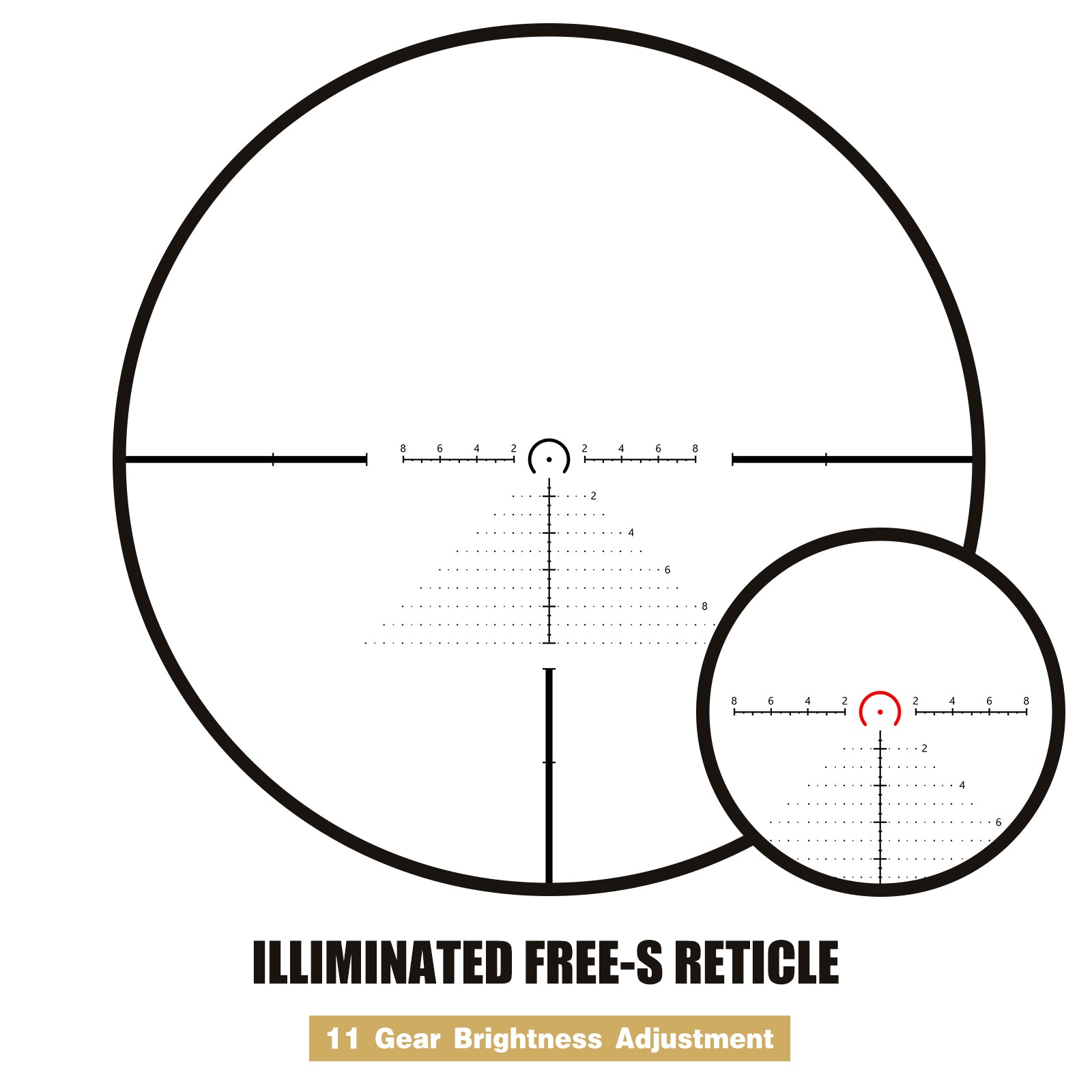 11 níveis de brilho ajustáveis para o retículo vermelho, compatíveis com dispositivos de visão noturna, garantindo clareza em condições de pouca luz.